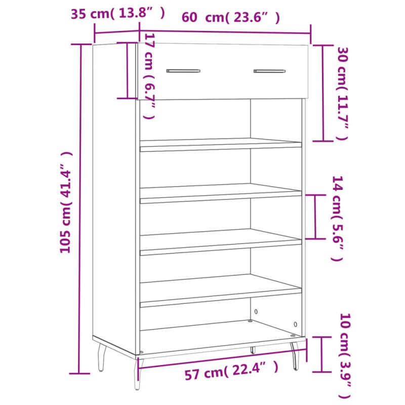 Поддържайте обувките си организирани и създайте подредена среда с този елегантен шкаф за обувки! Издържлив материал: Инженерната дървесина е с изключително качество с гладка повърхност и също така се отличава със здравина, стабилност и устойчивост на влага.Достатъчно място за съхранение: Този шкаф за обувки има 1 чекмедже и 5 отворени отделения, осигуряващи достатъчно пространство за съхранение на всички видове обувки.Стабилен плот на шкафа: Горната част на тази стойка за обувки е подходяща за поставяне на любимите ви декоративни предмети като вази, саксийни растения и др.Практичен дизайн: Железните крачета добавят индустриален стил към вашия интериор, като същевременно осигуряват стабилност. Алуминиевите дръжки на чекмеджетата са стилни и издръжливи. Внимание:За предотвратяване на преобръщане този продукт трябва да се използва с предоставения анкер за стена.