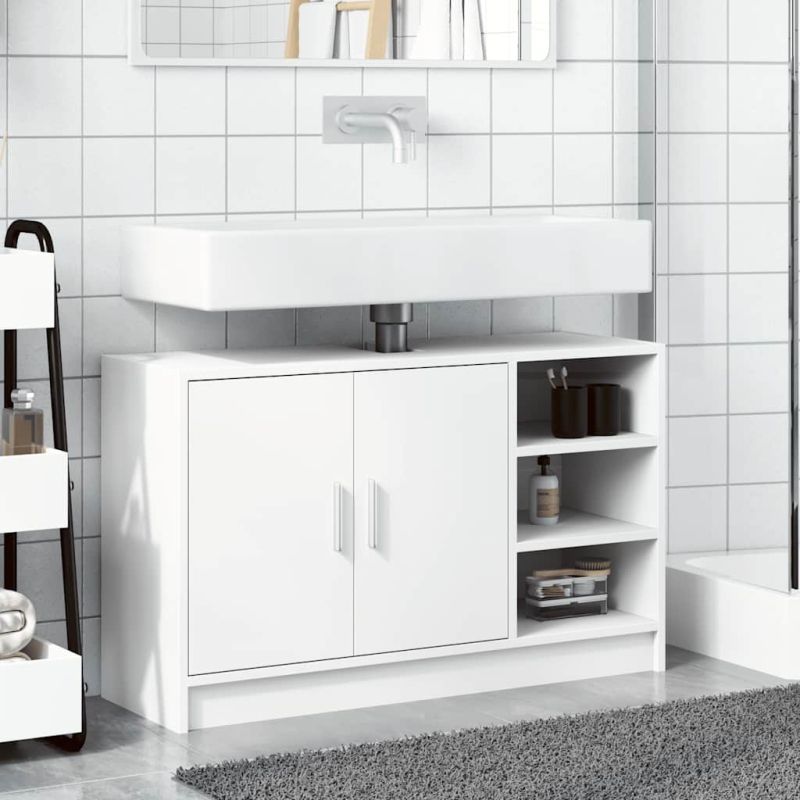 Този шкаф за мивка е предназначен да бъде чудесно допълнение към вашата баня, придавайки ѝ подреден и красив вид! Издръжлив материал: Инженерната дървесина е с изключително качество с гладка повърхност и също така се отличава със здравина, стабилност и устойчивост на влага.Достатъчно място за съхранение: Шкафът за под мивка, разполагащ с 2 отделения с 2 врати и 3 отворени отделения, предлага достатъчно място за съхранение, за да съхранявате вашите различни ежедневни неща добре организирани и леснодостъпни. Горната част на шкафа е идеална за поставяне на мивката.Лесна за поддръжка: Благодарение на гладката си повърхност, шкафът за баня се почиства лесно с влажна кърпа и изисква по-малко поддръжка. Внимание:За да предотвратите преобръщане, този продукт трябва да се използва с предоставеното устройство за закрепване на стена.