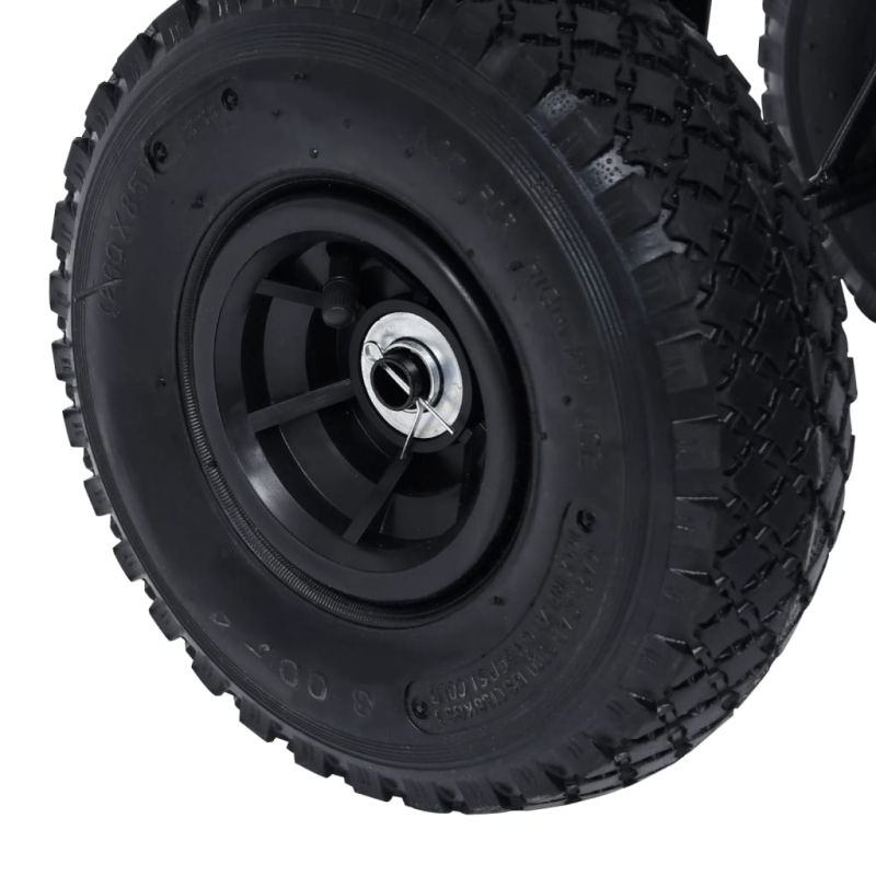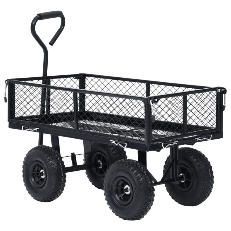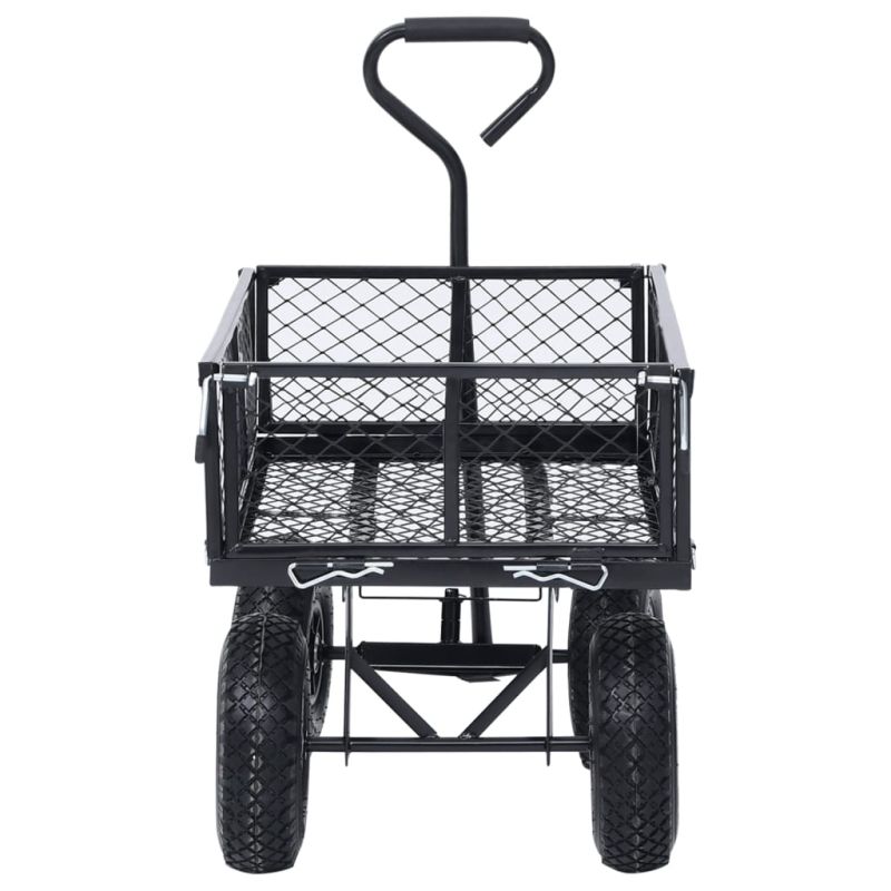 Отличаваща се със здрава и стабилна стоманена конструкция, тази ръчна количка е идеална за редица градинарски дейности. Изработена от устойчива стомана, градинската количка е изключително стабилна и издръжлива. С максимална товароносимост от 250 кг, ръчната количка може лесно да транспортира цветя, листа, дървета и други неща. Страничните панели могат да бъдат отворени с крепежите за бързо освобождаване, за да се натовари и разтовари лесно. В допълнение, големите устойчиви пневматични колела ви позволяват лесно да дърпате количката по терени с неравни повърхности. Подплатената дръжка осигурява здрав захват. Моля, обърнете внимание, че тя не е подходяща за превозване на деца. В доставката не е включена постелка за градинската количка, но може да бъде закупена в нашия магазин. Прочетете внимателно ръководството и разберете инструкциите преди употреба. Този продукт не е играчка. Не използвайте продукта за непредвидени цели. Този продукт е предназначен само за употреба на открито. Не извършвайте промени или модификации на този продукт. Почиствайте само с влажна кърпа. Не използвайте силни индустриални почистващи вещества. Преди да използвате продукта, уверете се, че всички болтове и връзки са здраво затегнати и че всичко е в ред. Възрастен човек трябва редовно да проверява връзките. Не претоварвайте количката. Уверете се, че товарът е разпределен равномерно. Не завивайте прекалено бързо, тъй като това може да доведе до нестабилност на товара, загуба на равновесие на количката и падане на предметите. Не издърпвайте количката от бордюри или други повдигнати места, тъй като това може да повреди товара и/или количката. Когато е възможно, използвайте рампа. Не напомпвайте гумите с прекалено много въздух, тъй като това може да ги повреди поради плътността. Ако продуктът е повреден или има дефекти, моля, свържете се с дистрибутора или обслужването на клиенти. Внимание! Продуктът не е подходящ за превоз на деца.