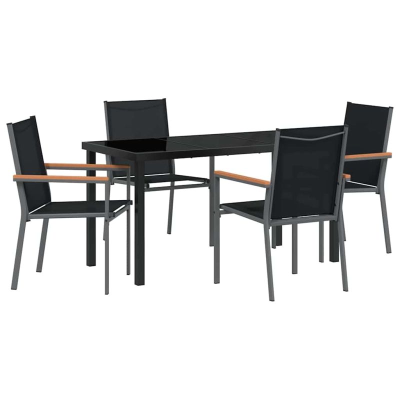 Комплектът за градинско хранене е супер сладък за вашата градина или тераса, добавяйки модерен стил за открити събирания през топлите месеци. Със стилни линии и гладки черни повърхности, той идеално се вписва в модерни открити пространства. Проектира се за стил и удобство, а също така предлага приветливо място за семейни вечери, разговори с приятели или просто релакс под откритото небо. Материали: Този комплект е направен от текстил и прахово боядисана стомана, така че е и стилен, и практичен. Текстилът е устойчив на атмосферни условия и е супер подходящ за целогодишна употреба. Тези материали са избрани да устояват на природата и да запазват комплекта готин през цялата година. Включени компоненти: Всеки стол има текстилена облегалка за комфорт. Стъклената повърхност на масата е не само стилна, а и лесна за почистване. Дървените подлакътници добавят допълнителен комфорт и се съчетават с модерен антрацитов цвят на рамката и краката. Функции / Функционалност / Дизайн: Този комплект се отличава с простота и практичен дизайн. Изработен е от UV-устойчиви материали, така че не трябва да се тревожите за избледняване или износване от слънцето. Праховото покритие дава допълнителна издържливост и изглежда много готино. Препоръчителни употреби: Идеален е за външни пространства – идеално пасва на градини, тераси и патоси. Отличен е за неформални събирания или специални поводи, където комфортът и стилът са важни. Поддръжка и грижа: Запазете комплекта в добро състояние с малко внимание: използвайте покривало, когато не го ползвате и избягвайте агресивни почистващи препарати. Просто бързо избърсване с суха кърпа ще поддържа столовете в отлично състояние. Максимално 110 кг на седалка.