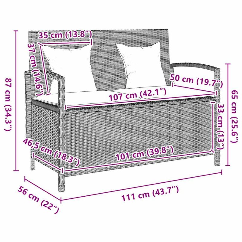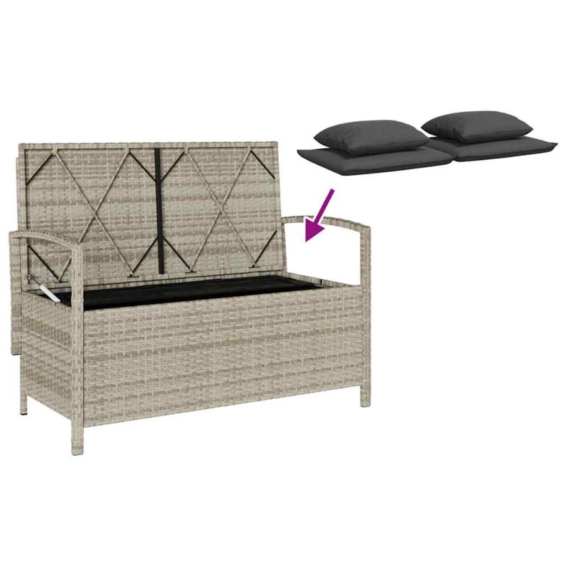 Тази градинска пейка за съхранение не само предлага места за сядане на открито, но е и идеална за съхраняване на възглавници за мебели на открито, градински принадлежности, кърпи за басейн и други предмети, които са подредени и лесно достъпни. Издръжлив материал: PE ратан, известен също като полиратан, е здрав синтетичен материал с малко необходима поддръжка, който прилича на естествен ратан. Той е лек, лесен за почистване и често се използва за външни мебели поради своята издръжливост и устойчивост на атмосферни влияния.Функция за съхранение: Градинската седалка разполага с място за съхранение отдолу, оборудвано с водоустойчива чанта за съхранение на възглавници, играчки и други предмети. Вътрешната торба може да бъде здраво прикрепена към седалката с помощта на закопчалки, което осигурява стабилност и предотвратява движението ѝ.Безопасно и лесно отваряне и затваряне: Газовата пружина улеснява отварянето на капака и предпазва от затръшване или прихващане на пръсти.Удобна седалка: Тази мебел за открито, снабдена с плътно подплатени възглавници, предлага удобство при сядане.Калъф, който може да се сваля и може да се пере: Тези възглавници за седалки имат подвижни калъфи за лесно пране и поддръжка. Добре е да се знае:За да сте сигурни, че вашите външни мебели ще останат красиви, ви препоръчваме да ги защитите с водоустойчиво покривало.