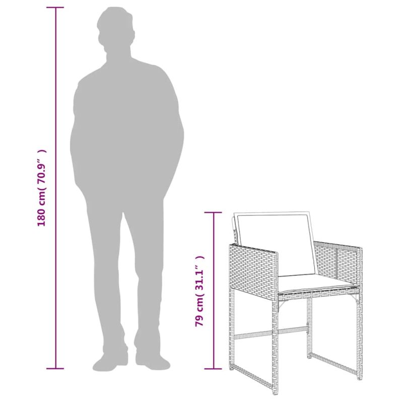 Отпуснете се и се насладете на живота на открито в тези удобни градински столове! Издръжлив материал: PE ратан, известен също като полиратан, е здрав синтетичен материал с малко необходима поддръжка, който прилича на естествен ратан. Той е лек, лесен за почистване и често се използва за външни мебели поради своята издръжливост и устойчивост на атмосферни влияния.Удобна седалка: Тази мебел за открито, снабдена с плътно подплатени възглавници, предлага удобство при сядане.Падаща облегалка: Тези столове имат падаща облегалка, която може да се сгъне за компактно съхранение.Калъф, който може да се сваля и може да се пере: Тези възглавници имат подвижни калъфи за лесно пране и поддръжка. Калъфките за възглавници на столовете имат капак отзад за лесно закрепване към столовете.Здрава и стабилна рамка: Стоманената рамка с прахово покритие гарантира, че градинската мебел е здрава и стабилна за ежедневна употреба на открито. Добре е да се знае:За да сте сигурни, че вашите външни мебели ще останат красиви, ви препоръчваме да ги защитите с водоустойчиво покривало. Максимално 110 кг на седалка.