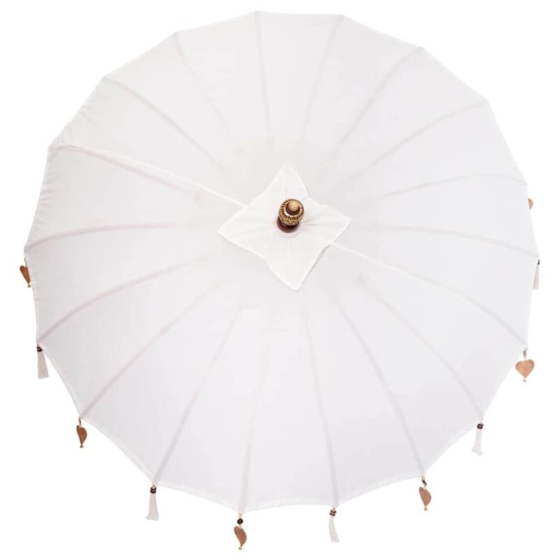 Балийският чадър с основа е елегантно и спокойно решение за сянка на открито, което ще обогати всяка градина или тераса. Създаден, за да отразява спокойната красота на балийската култура, той съчетава майсторство с практичност. Неговата кръгла форма в кремаво осигурява не само ефективна сянка, но и служи като привлекателен акцент в откритото пространство, носещ мир и хармония. Ръчно изработен детайл: Този чадър има стабилен дървен стълб и основа с ръчно резбовани детайли, демонстриращи умението на занаятчиите. Декорацията с звънчета и ресни придава уникалност и улавя същността на балийската култура. Материали: Изработен от памук, дърво и бамбук, този чадър е здрав и подчертава дизайна. Бамбуковите ребра и здрава памучна покривка осигуряват устойчивост при хубаво време. Функционален дизайн: Централната хъбка с оплетка от въже прави чадъра толкова красив, колкото и практичен. Голямото покритие осигурява уютна сянка, перфектно за отдих или хранене на открито, като поддържа хладка атмосфера. Стилни акценти: Декоративните детайли, като звънчета и ресни, добавят екзотичен фикс към чадъра. Те не само повишават естетическата стойност, но също така предлагат приятна мелодия, когато духа лек вятър. Лесно сглобяване: С чадъра и основата в комплекта, сглобяването е лесно, само с един човек и отвертка, така че бързо да може да се наслаждавате на сянката.