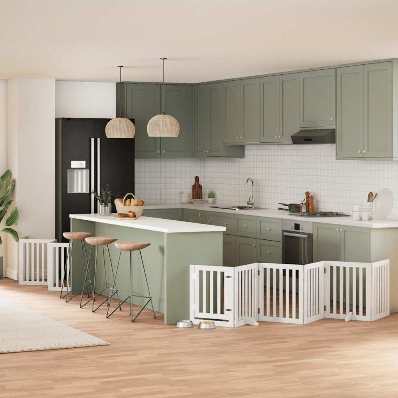 Преградата за кучета държи вашия домашен любимец в определена зона за движение, което може да го предпази и да предотврати безпокойството ви. Издръжлив материал: Преградата за кучета е изработена от тополова дървесина с боя на водна основа, което я прави издръжлива, дълготрайна и лесна за почистване.Лесна за използване: Преградата за кучета не изисква монтаж или пробиване, като така не уврежда дома ви. Тази преграда за кучета може да се сгъва напълно, когато е без крачета, което я прави лесна за пренасяне и съхранение в гардероба или на друго място.Практичен дизайн: Преградата за кучета е снабдена с две здрави крачета, които осигуряват стабилност и позволяват лесно регулиране. Освен това тя включва врата панел и е оборудвана с ключалки, което осигурява по-голяма сигурност и удобство както за вас, така и за вашите домашни любимци.Множество приложения: Тази преграда за кучета може ефективно да попречи на домашните ви любимци да я прескочат и да преминат през нея. Ето защо тя е идеална за обезопасяване на домашните ви любимци във всекидневната, кухнята, на стълбището и на вратата.