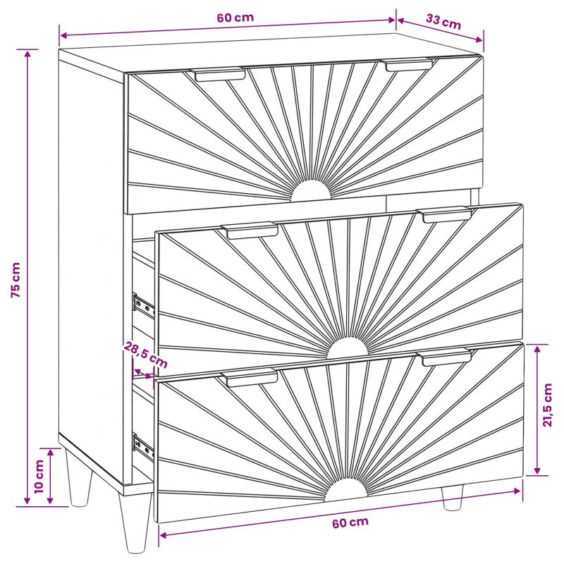 Този страничен шкаф от масивно дърво е истински пример за съвременния дизайн - стилен и елегантен, идеален за вашата трапезария или всекидневна. Изработен е от висококачествено мангово дърво, което обещава дълготрайност и лесно се комбинира с различни интериори в атрактивно черно и златно. Модерна простота: Проектиран с минималистичен стил, този страничен шкаф е идеален за съвременния дом, съчетавайки функционалността с чисти линии и елегантен вид. Той инжектира изтънченост в пространството си. Здрави материали: Направен от солидно мангово дърво, той предлага стабилна основа за дълготрайна употреба. Манговото дърво е издръжливо и с времето придобива красив вид, запазвайки стойността му като надеждно решение за съхранение. Ефективно съхранение: Вътрешността на шкафа предлага обширно място за съхранение, за да подредите всички трапезни принадлежности и ценни спомени. Той е идеалното решение за вашите нужди и поддържа всичко под ред. Забележителен вид: С впечатляващата си комбинация от златно и черно, той е акцент за вашия дом. Смелият цветови контраст привлича вниманието и добавя лека нотка на елегантност и характер. Указания за грижа: Запазвайте шкафа в отлично състояние, като просто прахосвате с чиста, суха кърпа. Не използвайте агресивни препарати, за да запазите естественото очарование на дървото.