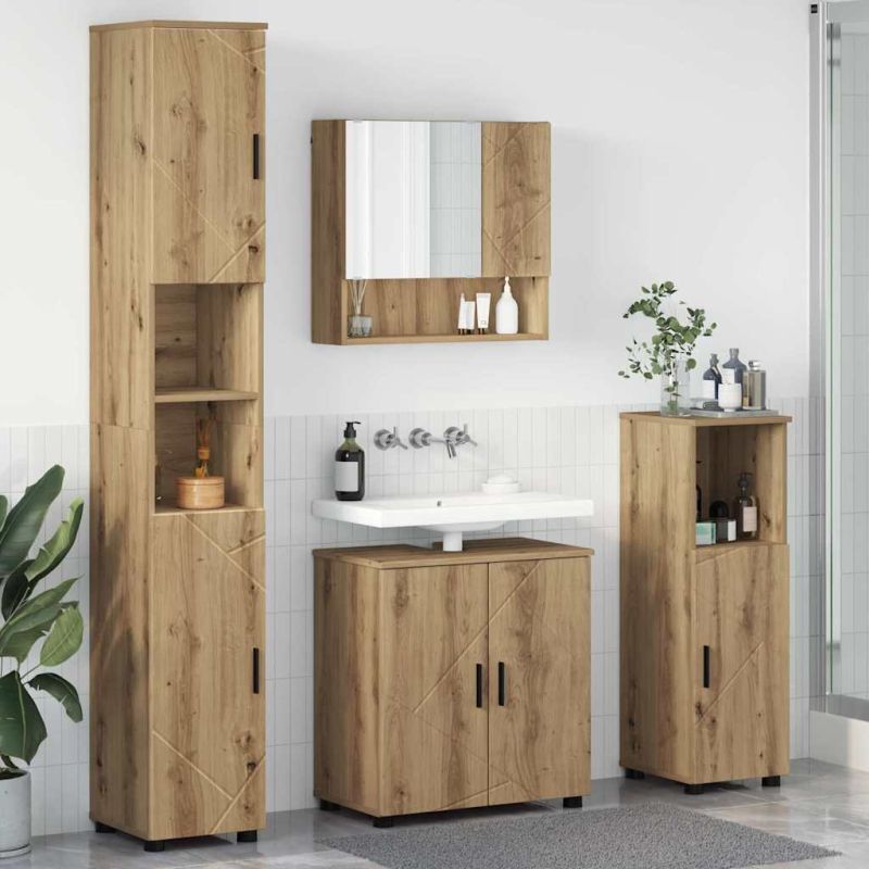 Този комплект модерни мебели за баня е идеален за всяка баня, предлагаща готини и практични решения. Със стилни линии и минималистичен дизайн, той е страхотен за съвременния интериор. Завършен е с шкаф за мивка, шкаф за огледало, висок и нисък шкаф, които съчетават функционалност и естетика. Материали: Комплектът е направен от инженерна дървесина и метал, осигуряващи дълготрайност и модерен вид. Идеален е за влажна среда и добавя стил в банята. Включени компоненти: В комплекта има четири части: шкаф за мивка, шкаф за огледало, висок и нисък шкаф, които предлагат разнообразна функционалност и достатъчно пространство за съхранение. Характеристики /Функция /Дизайн: Със стенен монтаж, комплектът е подходящ за по-малки бани и предлага лесен достъп до нещата с халки за врати и бар handles. Препоръчителни употреби: Идеален е за лични и гостски бани, осигуряващ стил и нужното място за съхранение. Поддръжка и поддържане: Лесен за поддръжка — просто го избърсвайте с кърпа. Избягвайте пряката вода, за да запазите външния вид и качеството.