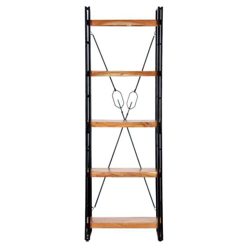 Добавете индустриален стил към дома или офиса си с нашата библиотека с 5 рафта. Тази етажерка за книги предлага идеално решение за съхранение и подреждане на колекцията ви от книги, списания, документи или декоративни елементи, като фото рамки и колекции. Библиотеката има здрава прахово боядисана стоманена рамка, която ѝ придава индустриален вид.Етажерката е изработена от масивно акациево дърво – тропическа твърда дървесина с красиви шарки, която е устойчива на атмосферни влияния и издръжлива. Всяка стъпка от процеса се извършва с най-голямо внимание, било то полиране, боядисване или лакиране. Изкусната изработка и привличащите погледа дървесни шарки правят всяка мебел отличителна и малко по-различна от останалите. Доставката е на произволен принцип. Тази библиотека се сглобява лесно. Важна забележка: Цветовете и шарките на дървото варират, което прави всеки от нашите рафтове уникален; доставката е на случаен принцип.