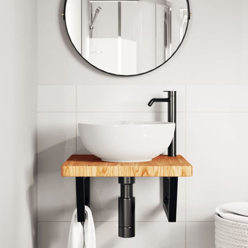 Стенният рафт за мивка се прикрепя сигурно към стената, осигурявайки елегантно и спестяващо място решение за вашата баня. Здрав и дълготраен: Този рафт за мивка е комбиниран със стоманена конструкция и плот от масивна дъбова дървесина, което го прави здрав, стабилен и дълготраен. Спестяване на място: Плаващият рафт за мивка има достатъчно място за съхранение на кремове и дребни предмети. Благодарение на трапецовидната форма можете да закачите кърпи или други неща на опората, за да спестите място. Лесен за използване: Плотът се доставя без дупки, за да позволи на мивката да се монтира отляво, отдясно или в центъра, в зависимост от изискванията на вашето помещение. Благодарение на предварително пробитите отвори в държача, той може лесно да се сглоби с плота и да се монтира на стената. Широки приложения: Благодарение на модерния си дизайн, осигурява допълнително пространство за различни видове бани. Добре е да се знае:Винтовете не са включени, можете да закупите винтовете отделно въз основа на информацията, предоставена по-долу. Прикрепване към стена: 2 бр дюбели M8 на скоба Дървен плот: 2 бр M5x18 винта (T=2) или 2 бр M5x20 винта (T=2,5/4 см) на скоба