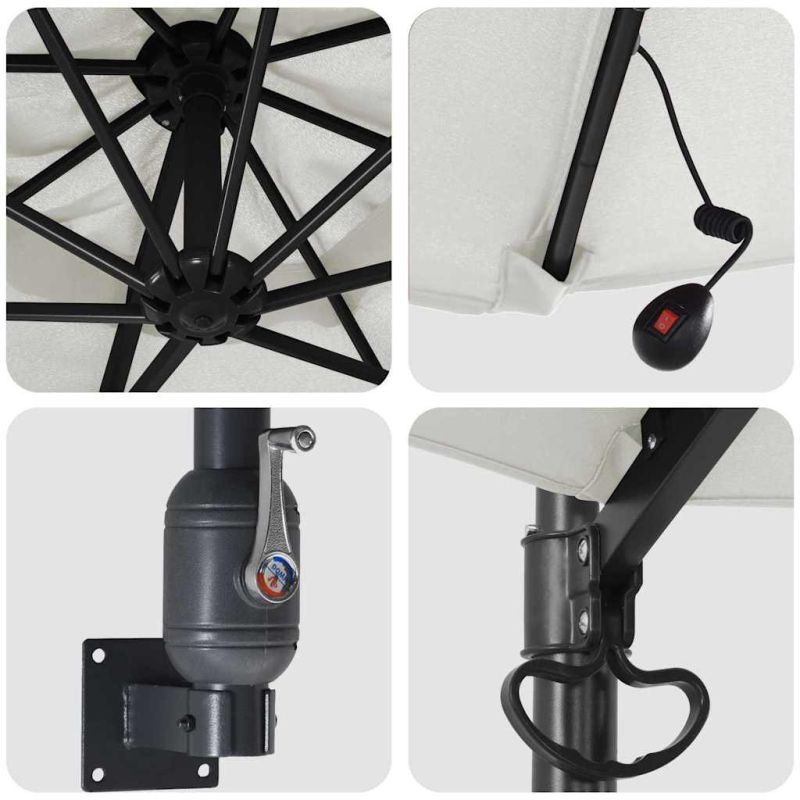 Този градински чадър внася модерна sophistication и функционалност в откритото ви пространство. Със своя забележителен дизайн, чадърът перфектно допълва съвременния външен декор, докато предлага основна защита от слънцето. Неговата елегантна кръгла форма и минимална декорация го правят стилно допълнение към градини, тераси или патии. Създаден както за естетическа привлекателност, така и за комфорт, чадърът може да бъде регулиран, за да осигури оптимална сянка, осигурявайки комфортно и релаксиращо изживяване на открито. Изработка от полиестер и стомана Градинският чадър е изработен от висококачествен полиестер и стомана, предлагаща здрава конструкция, готова да понесе условията на открито. Полиестерната материя предоставя гладка, непрозрачна повърхност, която защитава потребителите от слънцето, докато стоманената рамка гарантира стабилност и издръжливост. LED ленти Осветете вечерните си събирания с вградените гъвкави LED ленти. Проектирани да се прикрепят безпроблемно по ребрата на чадъра, тези светлини предоставят очарователна атмосфера, перфектна за релаксация през нощта или забавление на гости в откритите ви пространства. Ръчно регулиране на наклона Лесно настройте чадъра на желаното ъгълче с наклоняемия си дизайн. Ръчният механизъм позволява на потребителите да манипулират чадъра с ръка, предлагайки гъвкавост за постигане на най-ефективната защита от слънце и сянка през деня. UV и водоустойчивост Изработен с UV-устойчиви материали, чадърът гарантира защита срещу силни ултравиолетови лъчи, което го прави идеален за летен употреба. Освен това, неговите водоустойчиви свойства отстраняват леките дъждове, поддържайки качеството на чадъра с времето. Подходящ за употреба на открито Специално изработен за открити среди, този чадър е проектиран да устои на различни елементи, запазвайки естетическата си привлекателност. Независимо дали стои в градина, тераса или патия, той служи като интегрална част от декора на откритите мебели, комбинирайки стил с практичност. Продуктът съдържа малки части, които могат да представляват риск за малки деца. Дръжте ги далеч от техния обсег. Продуктът не е играчка! Уверете се, че децата не използват сенника.