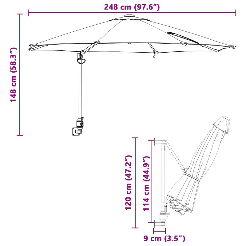 Градинският чадър е стилна добавка за всяко открито пространство, предлагайки обширен покрив, който ще ви предпази от слънцето в градината, на терасата или когато четете навън. Този модерен чадър има опростен и практичен дизайн с чисти линии и минималистичен стил, идеално се съчетава с всяка открита естетика. Перфектен за летни събирания или самостоятелно релакс, той е съществено подобрение за вашето открито удобство. Със своя универсален наклоняем механизъм, чадърът ви щади от жестокото слънце, осигурявайки комфорт през целия ден. LED лентите добавят допълнителна функция вечер, създавайки топло и приветливо осветление за всякакви мероприятия или просто релакс. Полиестерният материал, комбиниран с твърда стоманена конструкция, гарантира дълготрайност и хармоничен вид, което го прави идеален за продължителна употреба на открито. Лесно се отваря и затваря с ръчната манивела, идеално и за по-възрастни потребители. UV-устойчива тъкан Чадърът е направен от полиестер, който устойчиво се противопоставя на UV лъчи и минимизира избледняването. Този материал не само е дълготраен, но и запазва яркия си вид дълго време, правейки го траен елемент в градината ви. Лесна настройка С подвижен покрив и ръчна манивела, този чадър предлага разнообразие от ъгли за защита от слънцето. Можете да нагодите сянката по предпочитание, осигурявайки максимален комфорт през целия ден. Никаква механична помощ не е нужна. Светещи LED лампи LED осветлението под чадъра придава страхотна атмосфера вечер. Чадърът работи на слънчева енергия, а лампите ще осветят вашето открито пространство и ще направят вечерите по-забавни. Модерно приложение Идеално пригоден за открити пространства, чадърът се вписва супер на тераси, патии и в градините. Осигурявайки функционалност и красив вид, той е идеален за семейни събирания, празнични моменти или просто, за да се отпуснете. Насоки за грижа За най-добри резултати отваряйте и затваряйте чадъра с ръчната манивела, за да предотвратите ненужно натоварване. Уверете се, че LED лампите са чисти и соларният панел е свободен от прах, за да увеличите ефективността на осветлението. Продуктът съдържа малки части, които могат да представляват риск за малки деца. Дръжте ги далеч от техния обсег. Продуктът не е играчка! Уверете се, че децата не използват сенника.
