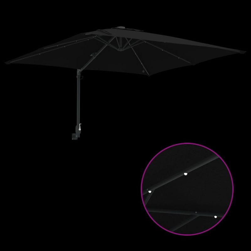 Този градински чадър съчетава практичност и модерен стил, за да можеш да се наслаждаваш на открито, докато оставаш на сянка. Гладкото полиестерно покритие е водоустойчиво, така че ще останеш сух дори при лек дъжд и ще изглеждаш стилно на верандата или в градината. Идеален е за мързеливи следобеди или вечери навън. С вградените LED светлини това не е просто красив чадър, а и умен начин да се радваш на времето си на открито от ден до нощ. LED осветление: Чадърът има вградени LED светлини, които създават уютна атмосфера вечер. Тези светлини са на соларно или батерийно захранване, така че не се притеснявай за кабели. Регулируем механизъм: С ръчната манивела чадърът лесно се отваря и затваря. Наклоняващата функция ти позволява да настроиш ъгъла, за да е по-добре защитен от слънцето. Модерен дизайн: Този чадър има стилен, модерен вид с чисти линии, които повишават визията на всяко открито пространство. Водоотблъскваща тъкан: Изработен е от водоотблъскващ полиестер, така че предлага сянка и защита от лек дъжд. Ниска поддръжка: Лесно е да го поддържаш. Използвай водоустойчиво покритие, когато не е в употреба, и пръскай с водоустойчиво средство от време на време, за да го запазиш свеж. Продуктът съдържа малки части, които могат да представляват риск за малки деца. Дръжте ги далеч от техния обсег. Продуктът не е играчка! Уверете се, че децата не използват сенника.