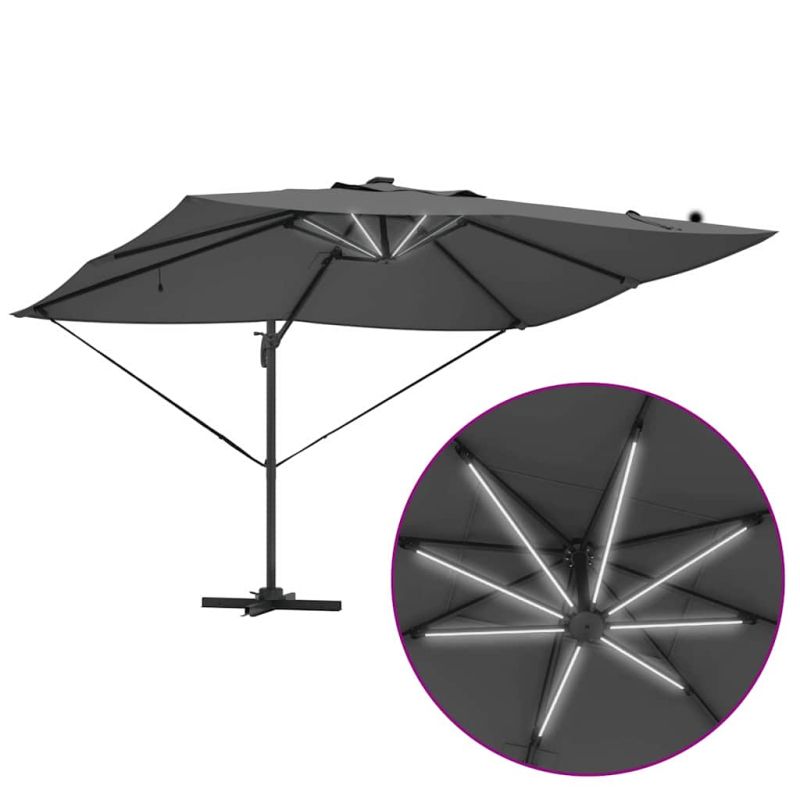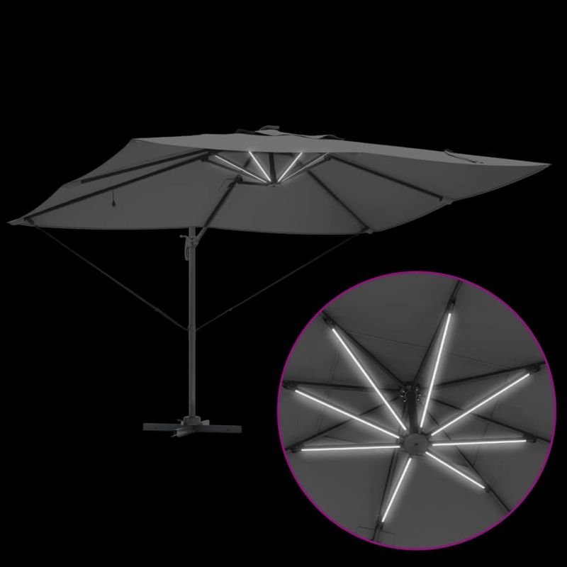 Кантилеверният чадър Roma е най-яката опция за сянка на открито, супер подходящ е за градини и тераси. Съчетава функционалност и стилен дизайн, с чисти линии и минимални детайли, които наистина освежават всяко открито пространство. Умният му кантилеверен вид ти дава много пространство отдолу, идеален за събирания или просто за релакс в горещите дни. Здрави материали: Кантилеверният чадър Roma е изработен от издръжлив полиестерен навес и алуминиеви части, които наистина издържат. UV-устойчивият полиестер не избледнява дори под силното летно слънце. Алуминият го прави лек, но здрав, с защита от ръжда и износване. Регулируеми функции: С механизъм за въртене на 360°, лесно следиш движението на слънцето през целия ден. Функцията за наклон ти позволява да получиш точния ъгъл за сянка когато ти трябва. Тази настройка покрива всичките ти нужди от сянка на открито. Функционално осветление: Включва стилни LED ленти, които отлично се вписват в дизайна на чадъра, осигурявайки приятно осветление за вечерни срещи или четене през нощта, без да развалят усещането. Модерен стил: Чадърът Roma улучва модерния стил с простия, но функционален дизайн. Гладкото, прахово боядисано покритие изглежда супер стилно, добавяйки елегантност на всяка открита декорация. Лесна поддръжка: Проектиран за живот на открито, този чадър почти не изисква грижи. Бързото избърсване премахва праха или мръсотията. Праховото боядисано покритие го прави устойчиво на атмосферни влияния. Този продукт не трябва да се изхвърля заедно с други битови отпадъци в Европейския съюз.