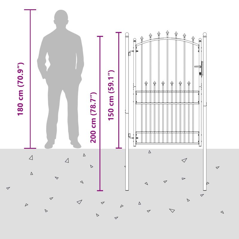 Съвременната врата с зъбци добавя модерен акцент на всяка открита среда. Тази врата, с чисти линии и ненатрапчив стил, предлага естетическа стойност и функционалност. Прахово боядисаната стомана я прави устойчива на атмосферни влияния, идеална за градини или тераси. Качество на материала: Изработена от прахово боядисана стомана, устойчива на всички климатични условия. Този материал предлага гладък завършек, който подхожда на съвременната естетика, осигурявайки дълготрайна издръжливост. Здравината ѝ гарантира, че имота ви остава подсигурен през всички сезони, с минимална поддръжка, нужна за поддържане на безупречния ѝ вид. Здрави заключващи механизми: Оснащена с ключалки, тази врата повишава сигурността, предотвратявайки неразрешен достъп. Известни с мощността си, тези ключалки са с ключово управление, идеални за по-тежки конструкции. С три включени ключа, те осигуряват спокойствие, защото вашата градина и тераса са защитени дори когато не сте там. Архитектурен стил: Арковият връх в комбинация с елегантни зъбци придава стилен вид, който украсява имота ви. Този артистичен елемент не само че увеличава визуалната привлекателност, но и предпазва от катерене. Балансът между форма и функция го прави подходящ за всякакви открити пространства. Пълен пакет: Доставя се с два устойчиви стълба и панти, този комплект улеснява инсталацията. Практичните компоненти осигуряват единен вид на вашето външно пространство. Проектирана за леснота и дълготрайност, компонентите гарантират безпроблемна работа и здрава структура. Насоки за поддръжка: Поддържайте елегантността ѝ с просто избърсване с влажна кърпа. Тази рутинна поддръжка гарантира, че вратата остава толкова впечатляваща, колкото и в деня на инсталирането, с минимални усилия.