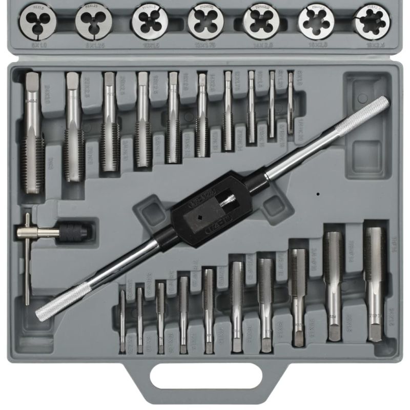 Комплекта от 40 части с плашки и метчици е идеален за почистване и рязане на вътрешни и външни резби и може да се използва за работа по автомобили и в работилници за механични цели. Произведени от висококачествена въглеродна стомана, инструментите са топлинно закалени за здравина и издръжливост. Благодарение на пригодения за комплекта куфар за съхранение, инструментите лесно може да се транспортират и не заемат много място. Доставката включва: 1 бр. върток за метчици: 50 мм, 1 бр. върток за метчици M6-M25, Т-образен върток за метчици, плашки, 1 бр. отвертка, 1 бр. върток за плашки 50 мм, 20 броя метчици и 20 броя плашки.