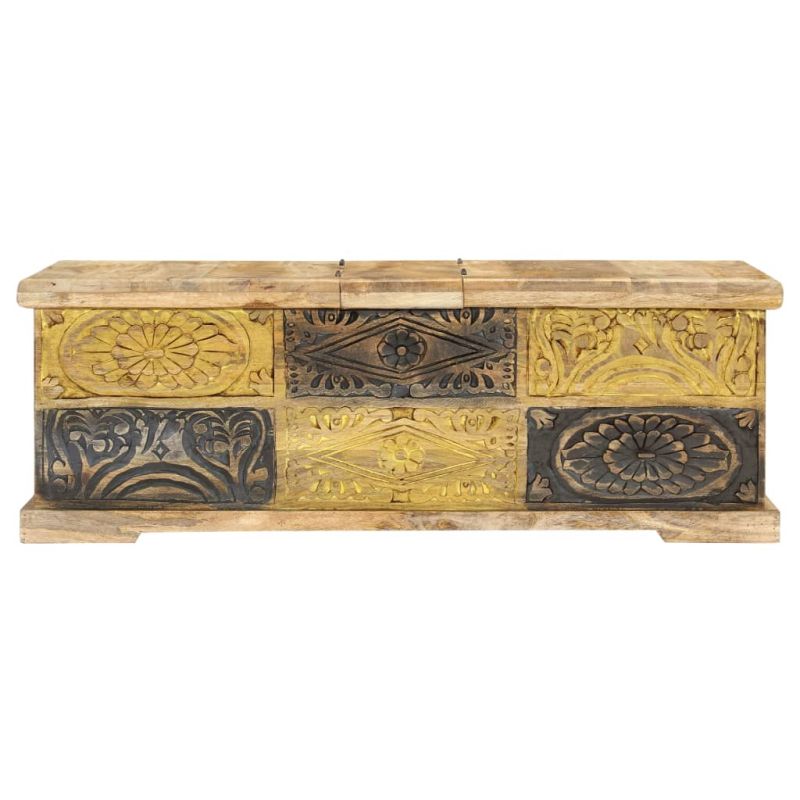 Отличаваща се с рустикален чар, тази зашеметяваща дървена масичка за кафе ще бъде вечно допълнение към вашия декор. Нейният масивен плот осигурява стабилна и сигурна повърхност, върху който можете да поставите напитки, вази, фруктиери и други орнаменти. Благодарение на устойчивата конструкция и материала от мангова дървесина, масата е изключително здрава и издръжлива. Манговото дърво представлява плътна и здрава твърда дървесина, която има красиви кафяви или златисти ивици и контури на повърхността. Всяка стъпка от процеса се извършва с най-голямо внимание, било то полиране, боядисване или лакиране. С 2 повдигащи се вратички, масата разполага с голямо място за съхранение, което е идеално за поставяне на мултимедийни уреди, книги, списания или малки предмети, които искате да държите подръка. Освен това може да се използва като странична маса, ракла за съхранение и т.н. Отпуснете се и се насладете на чудесно прекарано време със семейството и приятелите си около тази уникална масичка за кафе! Важна забележка: Цветовете на отделните артикули варират, което прави всяка маса уникална; доставката е на случаен принцип.