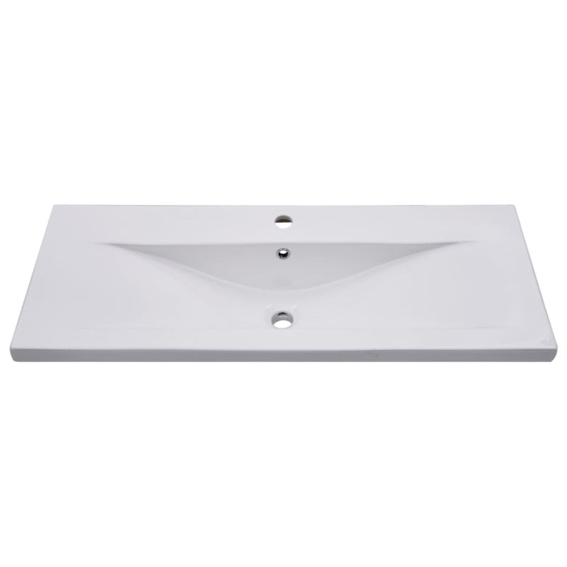 Този шкаф за баня с вградена мивка е идеален за вашата баня или тоалетна с впечатляваща, спретната визия. Шкафът за съхранение разполага с 1 чекмедже, което предлага достатъчно място за съхранение на вещи във вашата баня. Пасва идеално под мивката и прави съхранението в банята доста удобно. Изработена от керамика, мивката може да служи не само за ежедневна употреба, но и като украса във вашето жилищно пространство. Благодарение на модерния и съвременен дизайн, този умивалник определено ще подхожда на всеки декор. Също така е оборудвана с преливник за изтичане на вода, когато се напълни твърде много. Нейната лъскава повърхност носи модерен, но елегантен дизайн. Освен това шкафът и мивката се почистват лесно с влажна кърпа. Моля, обърнете внимание: Кранът и отводнителната тръба не са включени в доставката. Децата трябва да бъдат наблюдавани, за да се гарантира, че няма да си играят с уреда. Пазете децата далеч от зоната за сглобяване.Внимание: Прочетете внимателно инструкциите преди употреба и ги запазете за по-нататъшни справки.