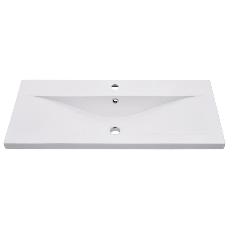 Този шкаф за баня с вградена мивка е идеален за вашата баня или тоалетна с впечатляваща, спретната визия. Шкафът е изработен от инженерно дърво, което го прави здрав и стабилен. Шкафът за съхранение има 1 отделение и 2 врати, предлагащи достатъчно място за съхранение на вещи. Пасва идеално под мивката и прави съхранението в банята доста удобно. Изработена от керамика, мивката може да служи не само за ежедневна употреба, но и като украса във вашето жилищно пространство. Благодарение на модерния и съвременен дизайн, този умивалник определено ще подхожда на всеки декор. Също така е оборудвана с преливник за изтичане на вода, когато се напълни твърде много. Нейната лъскава повърхност носи модерен, но елегантен дизайн. Освен това шкафът и мивката се почистват лесно с влажна кърпа. Моля, обърнете внимание: Кранът и отводнителната тръба не са включени в доставката. Децата трябва да бъдат наблюдавани, за да се гарантира, че няма да си играят с уреда. Пазете децата далеч от зоната за сглобяване.Внимание: Прочетете внимателно инструкциите преди употреба и ги запазете за по-нататъшни справки.
