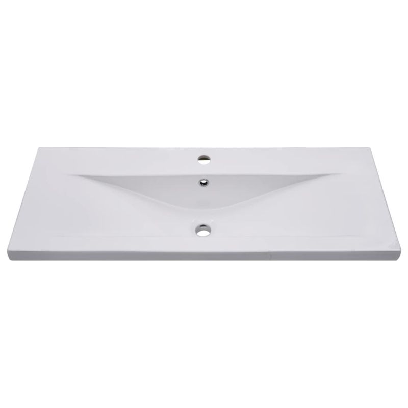Този шкаф за баня с вградена мивка е идеалното допълнение към вашата баня или тоалетна с впечатляващия си изчистен вид. Шкафът е изработен от ПДЧ, което го прави здрав и стабилен. Шкафът за съхранение е снабден с 1 отделение и 2 врати, предлагайки достатъчно място за съхранение на предмети. Той пасва идеално под мивката и прави съхранението в банята доста удобно. Изработен от керамика, умивалникът може да служи не само като съд за ежедневна употреба, но и като украшение във вашето жилищно пространство. Благодарение на своя модерен дизайн този умивалник определено ще подхожда на всеки интериор. Оборудван е и с преливник, който позволява изтичане на водата, когато се препълни. Гланцираната му повърхност придава модерен и същевременно елегантен дизайн. Освен това шкафът и мивката се почистват лесно с влажна кърпа. Моля, имайте предвид: Смесителят и сифонът не са включени в доставката. Децата трябва да бъдат наблюдавани, за да се гарантира, че не играят с уреда. Пазете децата далеч от зоната за сглобяване. Внимание: Прочетете внимателно инструкциите преди употреба и ги запазете за по-нататъшни справки.