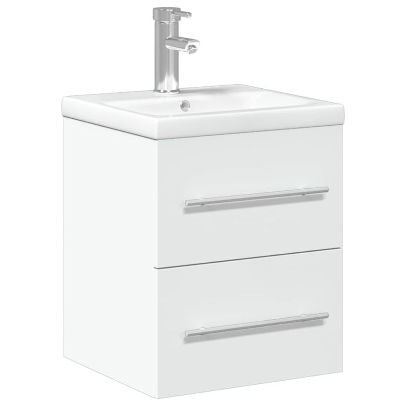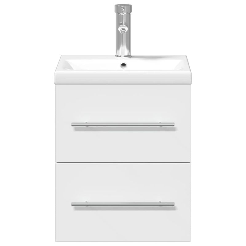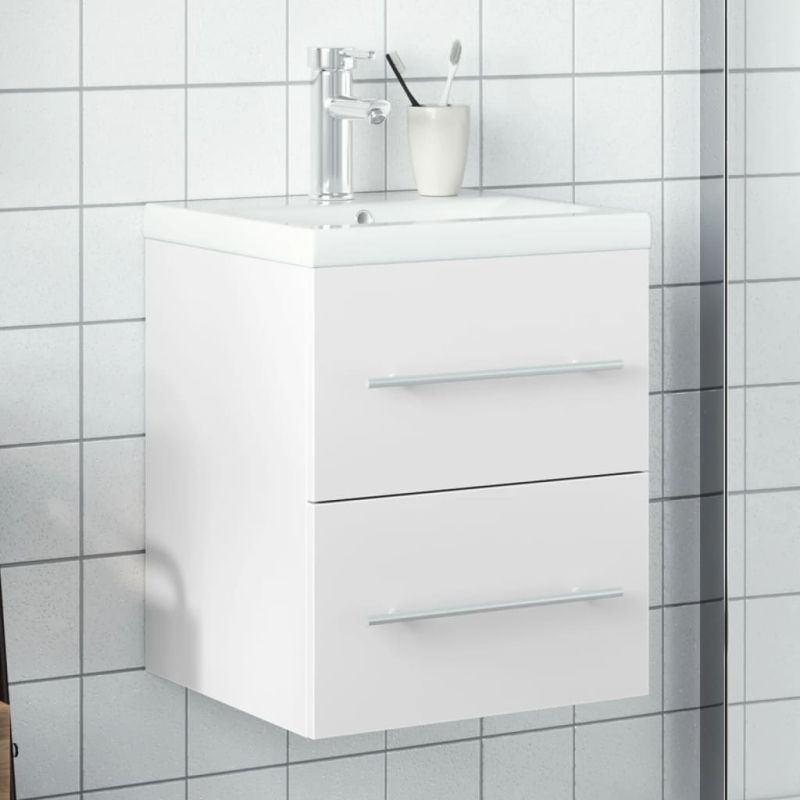 Този стилен шкаф за баня с вградена мивка, разполагащ с просторно пространство за съхранение, е отлично допълнение към вашата баня, като ѝ придава подреден и впечатляващ вид! Здрав материал: Шкафът за под мивка е изработен от инженерна дървесина, която е с изключително качество с гладка повърхност и също така се отличава със здравина, стабилност и устойчивост на влага.Достатъчно място за съхранение: Модулът за мивка за баня разполага с 1 чекмедже, което предлага достатъчно място за съхранение за вещи във вашата баня.Функция за стенен монтаж: Шкафът за баня може да се монтира на стена за допълнително място за съхранение. По този начин можете да използвате максимално пространството на пода и да поддържате чистота.Елегантна мивка: Мивката за баня е изработена от гладка керамика, която е дълготрайна и лесна за почистване. Лъскавата повърхност внася модерен и същевременно елегантен дизайн.Практичен преливник: Мивката е оборудвана с опция за предотвратяване на преливане, позволяваща на водата да излезе, когато се препълни. Добре е да се знае:Винт(ове) и щепсел(и) за вътрешността на стената не са включени. Търсете и използвайте винт(ове) и дюбел(и), подходящи за вашите стени. Ако не сте сигурни, потърсете професионална помощ. Прочетете и следвайте внимателно всяка стъпка от инструкциите.Включени са смесител и сифон клик-клак с преливник.Смесителят е за топла и студена вода, като при нужда от топла вода трябва да се свърже бойлер. Децата трябва да бъдат наблюдавани, за да се гарантира, че няма да си играят с уреда. Пазете децата далеч от зоната за сглобяване.Внимание: Прочетете внимателно инструкциите преди употреба и ги запазете за по-нататъшни справки.
