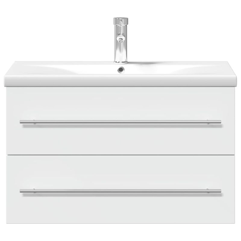 Този стилен шкаф за баня с вградена мивка, разполагащ с просторно пространство за съхранение, е отлично допълнение към вашата баня, като ѝ придава подреден и впечатляващ вид! Здрав материал: Шкафът за под мивка е изработен от инженерна дървесина, която е с изключително качество с гладка повърхност и също така се отличава със здравина, стабилност и устойчивост на влага.Достатъчно място за съхранение: Модулът за мивка за баня разполага с 1 чекмедже, което предлага достатъчно място за съхранение за вещи във вашата баня.Функция за стенен монтаж: Шкафът за баня може да се монтира на стена за допълнително място за съхранение. По този начин можете да използвате максимално пространството на пода и да поддържате чистота.Елегантна мивка: Мивката за баня е изработена от гладка керамика, която е дълготрайна и лесна за почистване. Лъскавата повърхност внася модерен и същевременно елегантен дизайн.Практичен преливник: Мивката е оборудвана с опция за предотвратяване на преливане, позволяваща на водата да излезе, когато се препълни. Добре е да се знае:Винт(ове) и щепсел(и) за вътрешността на стената не са включени. Търсете и използвайте винт(ове) и дюбел(и), подходящи за вашите стени. Ако не сте сигурни, потърсете професионална помощ. Прочетете и следвайте внимателно всяка стъпка от инструкциите.Включени са смесител и сифон клик-клак с преливник.Смесителят е за топла и студена вода, като при нужда от топла вода трябва да се свърже бойлер. Децата трябва да бъдат наблюдавани, за да се гарантира, че не играят с уреда. Пазете децата далеч от зоната за сглобяване. Внимание: Прочетете внимателно инструкциите преди употреба и ги запазете за по-нататъшни справки.