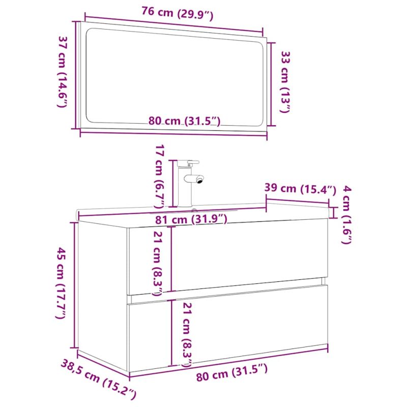Този стилен комплект мебели за баня, състоящ се от шкаф за мивка, вградена мивка и огледало, се вписва идеално във вашата баня или мокро помещение с впечатляваща, спретната визия. Стабилен и издръжлив материал: Инженерната дървесина е издръжлив и стабилен материал с гладка повърхност, която е устойчива на влага, изкривяване и разцепване, което я прави надежден избор за различни проекти.Голямо пространство за съхранение: Мивката за баня е снабдена с чекмедже, което предлага достатъчно място за съхранение на вещи в банята.Функция за монтиране на стена: Този шкаф за мивка в банята може да се монтира на стена, за да добави допълнително място за съхранение. По този начин можете да увеличите максимално подовото си пространство и да поддържате района чист.Преливник: Също така е оборудвана с преливник за изтичане на вода, когато се напълни твърде много.Лесна поддръжка: Благодарение на гладката си повърхност модулът за баня се почиства лесно с влажна кърпа и изисква по-малко поддръжка. Добре е да се знае:Винт(ове) и щепсел(и) за вътрешността на стената не са включени. Търсете и използвайте винт(ове) и дюбел(и), подходящи за вашите стени. Ако не сте сигурни, потърсете професионална помощ. Прочетете и следвайте внимателно всяка стъпка от инструкциите.Кранът е за топла и студена вода, а ако имате нужда от топла вода, трябва да се свърже бойлер. Децата трябва да бъдат наблюдавани, за да се гарантира, че няма да си играят с уреда. Пазете децата далеч от зоната за сглобяване.Внимание: Прочетете внимателно инструкциите преди употреба и ги запазете за по-нататъшни справки.