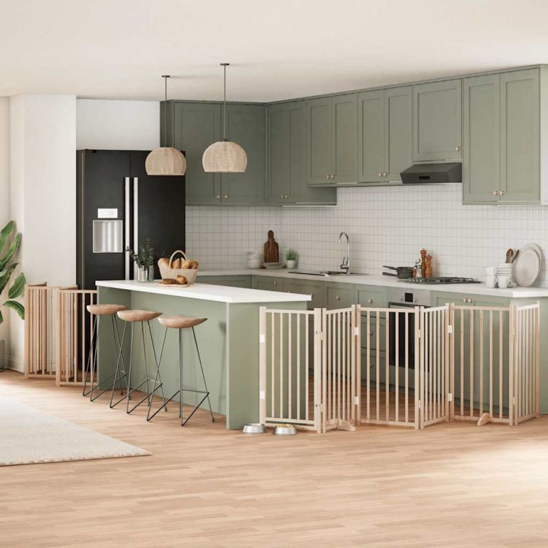 Преградата за кучета държи вашия домашен любимец в определена зона за движение, което може да го предпази и да предотврати безпокойството ви. Издръжлив материал: Преградата за кучета е изработена от тополова дървесина с боя на водна основа, което я прави издръжлива, дълготрайна и лесна за почистване. Лесна за използване: Преградата за кучета не изисква монтаж или пробиване, като така не уврежда дома ви. Тази преграда за кучета може да се сгъва напълно, когато е без крачета, което я прави лесна за пренасяне и съхранение в гардероба или на друго място. Практичен дизайн: Преградата за кучета е снабдена с две здрави крачета, които осигуряват стабилност и позволяват лесно регулиране. Освен това тя включва врата панел и е оборудвана с ключалки, което осигурява по-голяма сигурност и удобство както за вас, така и за вашите домашни любимци. Множество приложения: Тази преграда за кучета може ефективно да попречи на домашните ви любимци да я прескочат и да преминат през нея. Ето защо тя е идеална за обезопасяване на домашните ви любимци във всекидневната, кухнята, на стълбището и на вратата.