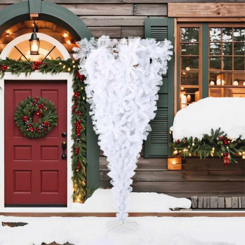 Обърната изкуствена коледна елха със стойка, бяла, 210 см