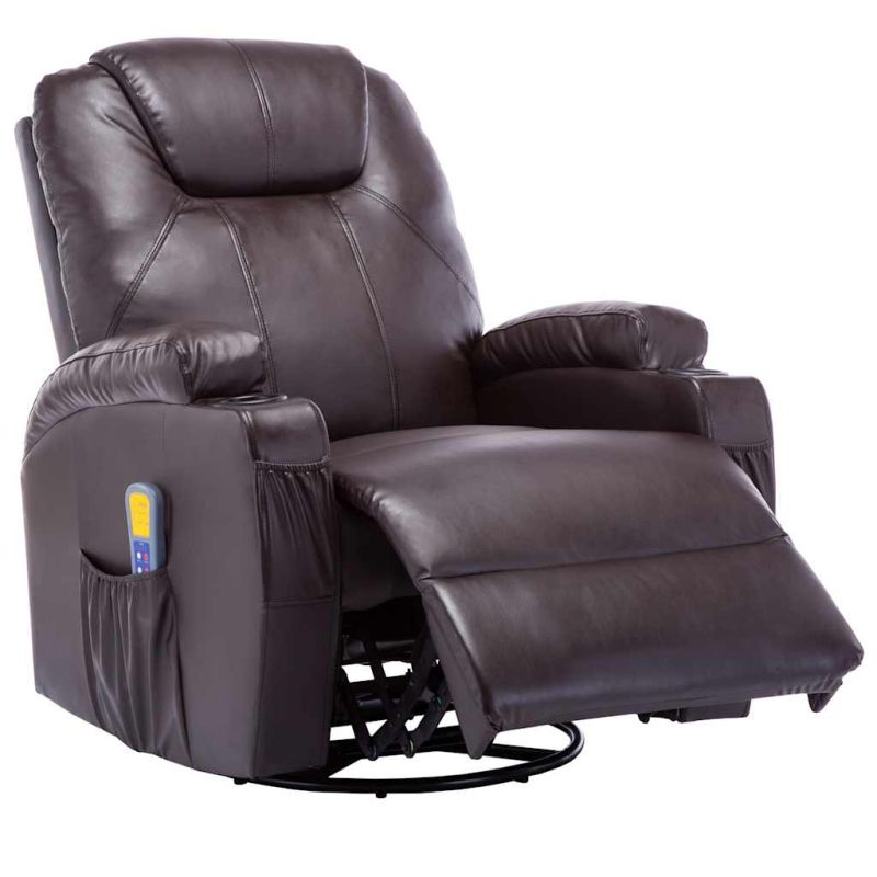 Нашият висококачествен електрически люлеещ се масажен стол ще бъде перфектният избор за вас, за да имате пълна релаксация след натоварен ден. Тапициран с първокласна изкуствена кожа заедно с дебело подплатената седалка и облегалка, този въртящ се стол е проектиран да ви осигури максимален комфорт. ТВ фотьойлът се характеризира с въртяща се система, която може да осигури 360-градусов изглед към стаята. Масажният стол с люлееща функция има 8 масажиращи възела за успокояване на цялото ви тяло. Облегалката и поставката за крака могат да се регулират в различни ъгли според вашите нужди. Включеното дистанционно управление може да се прибере в страничния джоб на масажния стол. Електрическият масажен стол се сглобява лесно. Забележка:Продуктът има USB конектор, но не е включен сертифициран източник на захранване от 5V USB Максимално 110 кг на седалка. Съобразете се с риска от открит огън и други източници на силна топлина в близост до продукта. GPSR