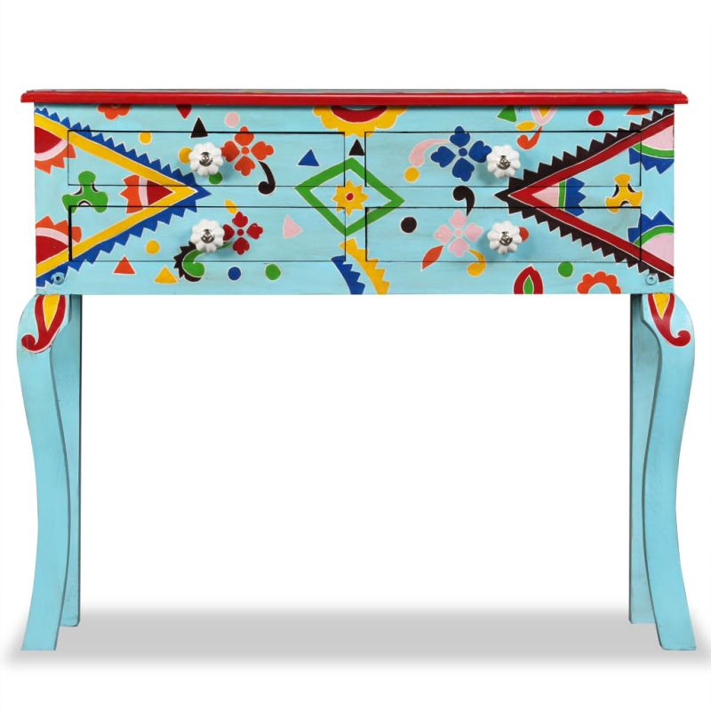 Тази уникална, красива конзолна маса ще добави цвят и ще се превърне в акцент на вашата всекидневна или спалня. С удивителния си дизайн тази ръчно боядисана конзолна маса няма да остане незабелязана, когато поканите гостите. Масата е ръчно изработена от мангово дърво, което е едновременно трайно и красиво, а майсторската изработка добавя към впечатляващия ѝ ретро стил. Тя е с богати декоративни ръчно изрисувани детайли, които излъчват елегантност и подчертават изискания външен вид. Отличителните дръжки улесняват отварянето на чекмеджетата и придават стил на масата. Конзолната маса има 4 чекмеджета и осигурява достатъчно пространство за съхраняване на предмети. Цветният плот е идеален за поставяне на декоративни елементи, като вази, фотоалбуми, кошници за плодове и др. Сглобяването е лесно.