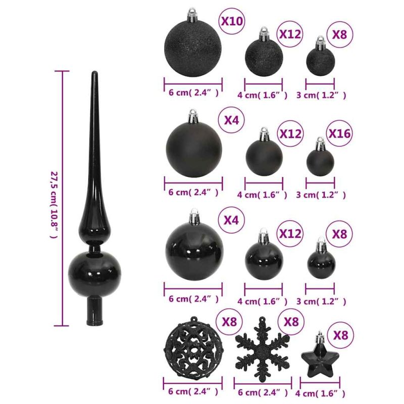 Насладете се на радостта от Коледа с фантастичния комплект коледни топки, които да украсят вашата елха или дом! Устойчив на разбиване материал: Тези коледни топки за елхи са направени от полистирен, който съчетава чара на истинското стъкло с отличната устойчивост на разбиване на пластмасата.Различни стилове и размери: Тази колекция от коледни топки включва топки в три диаметъра (3 см, 4 см и 6 см), снежинки, звезди и връх за елха. Тези топки имат четири стила (матирани, блестящи, лъскави и ажурни).Лесни за закачане: Тези коледни топки имат примка в горната част, за да можете лесно да ги закачите на клоните на дърветата.Леки: Тези декорации за коледно дърво са леки, така че няма да натежат на клоните на коледното дърво. Дори децата ви могат да помогнат за украса на коледната елха.Широко приложение: Тези коледни декорации могат да се използват във всички части на вашия домашен интериор – от коледни елхи, гирлянди, венци, прозорци, парапети и др.