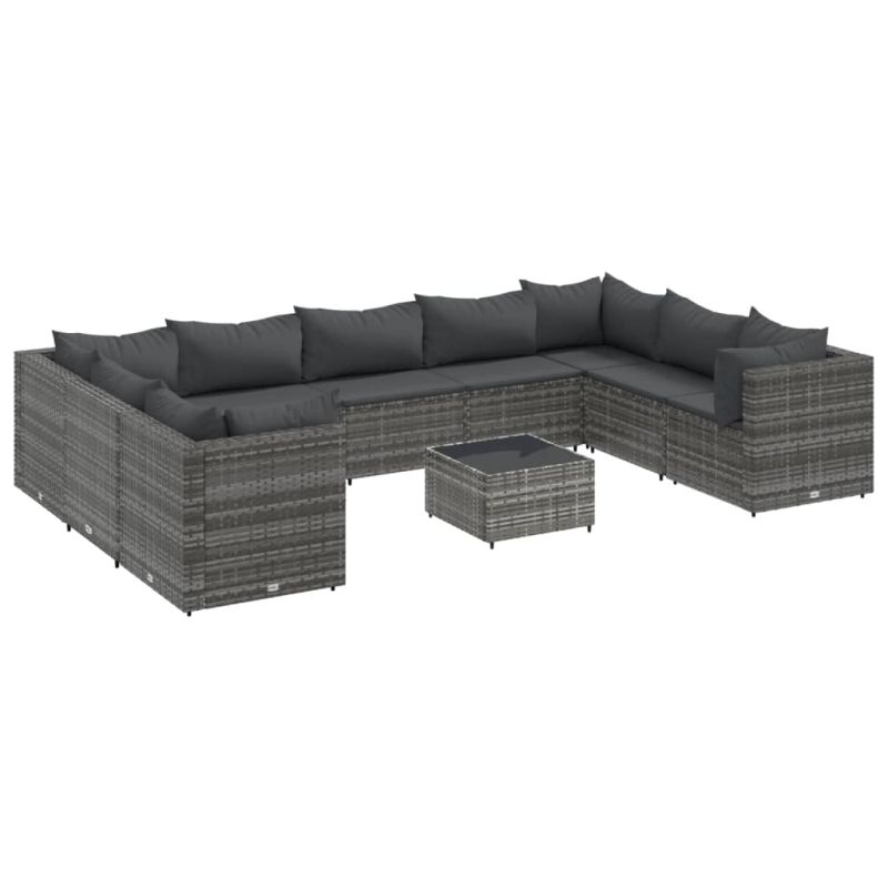 Градински комплект с възглавници, 10 части, сив, полиратан