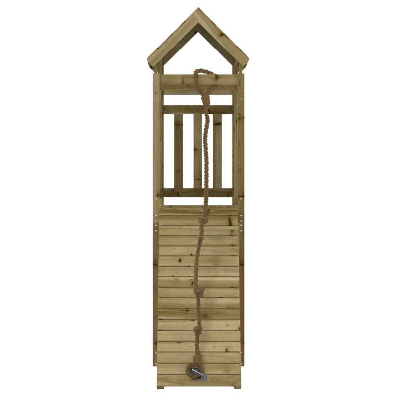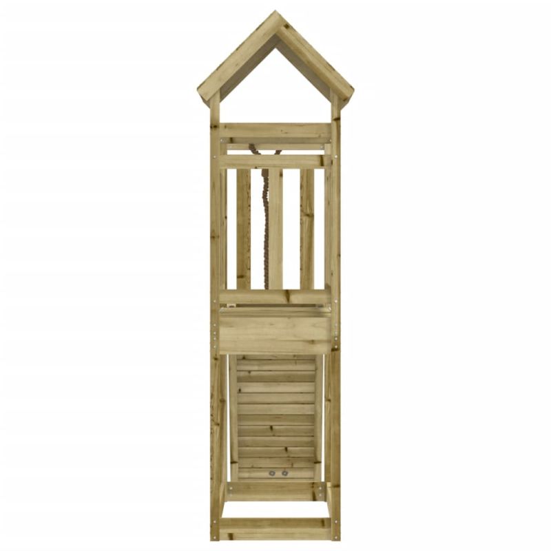 Искате ли да дадете на децата си свободата да играят у дома? Тази дървена къща за игра превръща задния ви двор в детска площадка за фантастични приключения! Импрегнирана дървесина: Тази градинска катерушка е изработена от борова дървесина, импрегнирана с вакуум. Масивната борова дървесина е красив естествен материал. Боровата дървесина е с продълговати шарки, а чеповете придават на материала характерния му рустик вид. Импрегнирането е процес на запазване, който се извършва с помощта на автоклави. Обработката под налягане повишава устойчивостта на гниене и атмосферни влияния.Здрава и стабилна рамка: Дървената рамка на градинската катерушка гарантира здравина и стабилност. Освен това крачетата във формата на буквата "А" на детската люлка позволяват баланс.Многофункционални центрове за дейности: Катерушката разполага с платформа с височина 90 см и се откроява със своята стена за катерене с въже и пясъчник. Вашите деца могат да поканят и своите приятелчета да се присъединят към забавлението.Внимателно разработен дизайн: Околните дървени парапети са проектирани така, че да гарантират безопасността на децата по време на веселите им игри. Освен това дървеният покрив осигурява сянка за вашите деца в горещите летни дни.Безкрайно забавление: Това дървено съоръжение за игра на открито, предлагащо много забавления, е идеалният начин децата ви и техните приятели да се веселят, да прекарват повече време в общуване и да създават безценни спомени! Внимание:Само за домашна употребаИзползване на откритоНе е подходяща за деца под 3 годиниПрепоръчителна възраст на потребителя: 3-8 годиниМаксимално тегло на потребител: 45 кг Добре е да се знае:За да бъде сглобяването възможно най-лесно, всеки продукт се доставя с ръководство. Предупреждение. Не е подходящ за деца под 3 години. Само за домашна употреба. GPSR