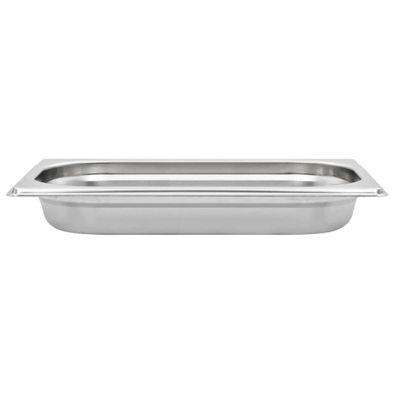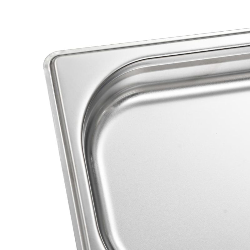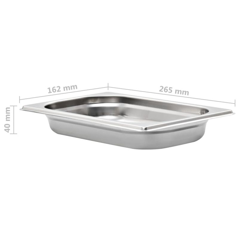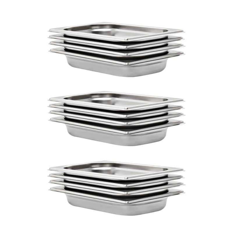 Тези стифиращи гастронорм контейнери ще бъдат чудесно допълнение към вашите кухненски съдове. Изработен от здрава неръждаема стомана, контейнерът за бен мари се отличава със здрава конструкция и се почиства лесно. Устойчивият материал предпазва тавите от драскотини и ги прави лесни за поддръжка. Тавата е с размери по стандарт гастронорм, което позволява универсална употреба и най-различни комбинации. Следователно тя ще се впише перфектно във всичките ви професионални кухненски шкафове и оборудване, като електрически сушилни, машини за миене на съдове и салатни барове. Съдовете могат да се подредят един в друга и да се приберат, за да пестят място, затова са много практични и идеални за използване в ресторанти, хотели, партита, както и у дома. Доставката включва 12 тави.
