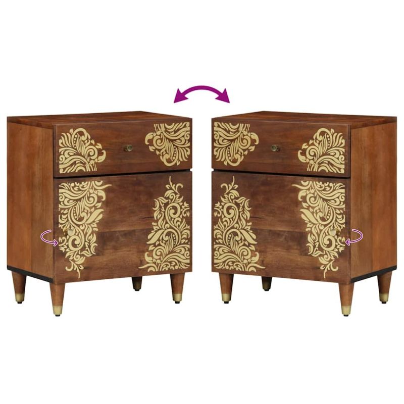 Това модерно нощно шкафче с врата е невероятен мебелен артикул, който съчетава функционалност и стил. С изчистените си линии и минималистичен дизайн, то носи съвременно излъчване и подхожда на много спални интериори. Идеално е, ако искате стилно място за съхранение до леглото, а просторният отсек е чудесен за нощни вещи или лампа, която да осветява помещението. Материали: Нощното шкафче е изработено от масивно мангово дърво, което гарантира дълготрайност. Страхотното качество на манговото дърво предлага стилен външен вид и издръжливост. Изграждането му осигурява устойчивост на ежедневна употреба, като запазва свежия си вид. Включени компоненти: Шкафчето идва с отделение, достъпно чрез пантирана врата, което улеснява достъпа до всичко вътре. Месинговите дръжки добавят шик и повишават привлекателността. Тези компоненти са лесни за управление, повишавайки както функционалността, така и елегантността. Характеристики / Функция / Дизайн: Ръчно рисуваната повърхност акцентира на дизайна му, като го прави естетически приятен и функционален. Съчетанието на модерен стил и практичност осигурява приятно изживяване. Препоръчителни приложения: Перфектно е за спални, шкафчето е чудесно за по-малки пространства, предлагайки място за съхранение на лични вещи, електроника или лампи, необходими за вечерно ползване, осигурявайки комфорт и стил. Грижа и поддръжка: Просто избърсвайте повърхността с чиста, суха кърпа, за да поддържате вида му. Избягвайте абразивни материали и агресивни химикали, за да запазите детайлите му.
