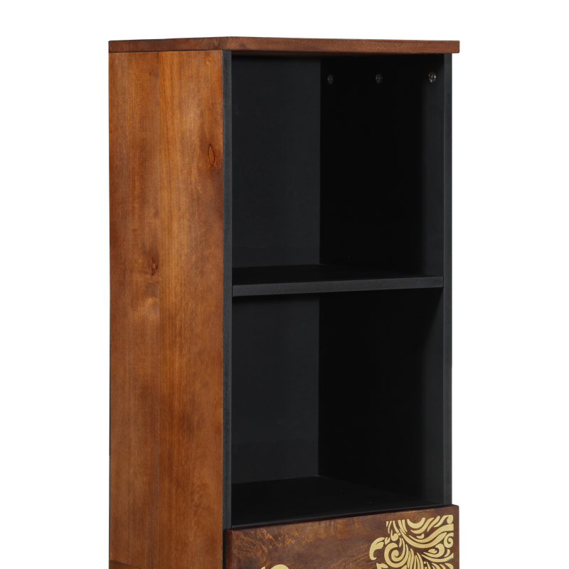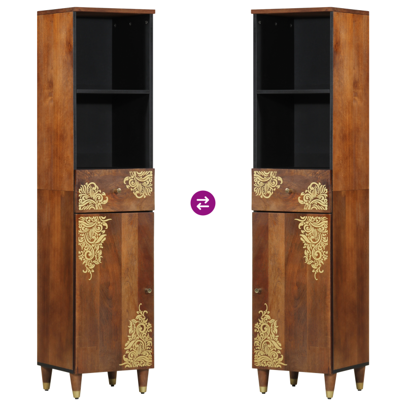 Този модерен шкаф за баня е истинска трансформация за всяка всекидневна. Със своите изчистени линии и функционалност, той обещава стил и практичност. Правоъгълната му форма добавя визуален интерес, а елегантният дизайн се вписва идеално в минималистичните интериори, докато предлага достатъчно място за всичко, което ви е необходимо. Премиум материали: Изработен е от мангово дърво и инженерна дървесина, което съчетава здравина с хубав вид. Манговото дърво е уникално с текстурата си, а инженерната дървесина предлага надеждност. Тези материали създават дълготраен шкаф, подходящ за всяко пространство. Елегантен дизайн: С блестящ златен отпечатък, шкафът излъчва стил и елегантност. Сложният модел го прави не само функционален, но и произведение на изкуството, което привлича погледите, където и да го сложите. Здрави компоненти: Месингови дръжки и крака добавят лукс и стабилност. Цилиндричните крака осигуряват силна основа, така че шкафът да може да носи различни предмети без проблем. Функционални врати: Вратите са вградени и дават лесен достъп до всичко, което се съхранява в шкафа. Чистият дизайн на вратите подчертава изтънчения вид на шкафа и го прави подходящ за всякакъв стил на интериора. Поддръжка и грижи: Избърсвайте шкафа редовно с влажна кърпа, за да запазите красивия му вид. Това е лесно и осигурява дълготрайност, така че да изглежда нов години наред.