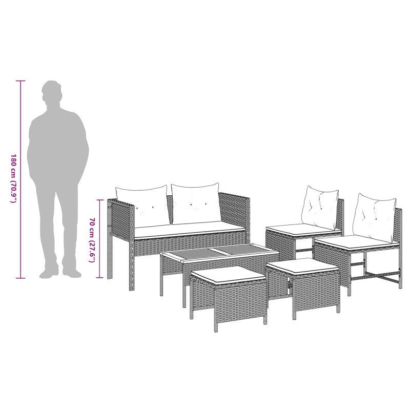 Този комплект градински дивани създава приятно помещение на открито. С модерен дизайн и чисти линии, той е идеален за всяка тераса или градина. Стилен в черно, осигурява елегантност. Перфектен е както за релакс, така и за посрещане на гости. Материали: Направен от здрав полираатан, комплектът съчетава стил и здравина. Полираатанът е устойчив на времето, така че ще ви служи дълго. Черната стоманена рамка добавя елегантност и сигурност. Включени компоненти: Комплектът включва двуседален диван, два стола, пуф и маса, предлагаща достатъчно места за гости. Възглавниците са от полиестер, удобни и лесни за поддържане, а масата от акациево дърво придава естествен вид. Функции /Функция /Дизайн: Проектиран за открито, комплектът е идеален и за слънчеви, и за дъждовни дни. Лек и модулен – можете лесно да изменяте начина, по който е подреден. Този дизайн не жертва комфорта и стила. Препоръчителни употреби: Перфектен за градини, тераси и балкони. Универсалният му вид е чудесен както за малки събирания, така и за големи партита. Поддръжка и грижи: За дълготраен вид просто почиствайте с влажна кърпа. Издръжливите материали не изискват много грижи, за да запазят красотата си.