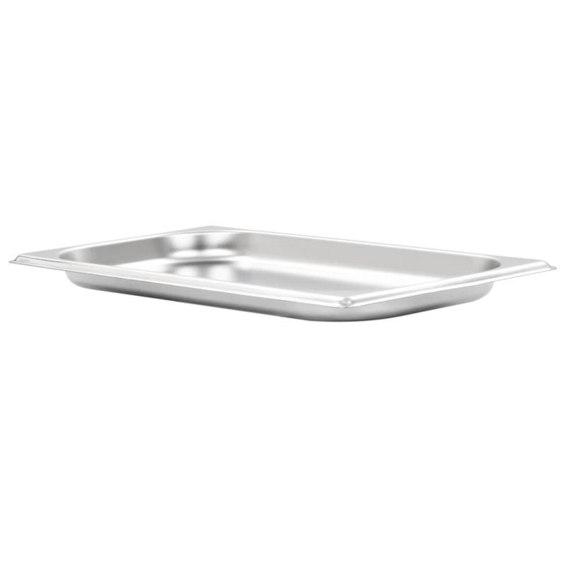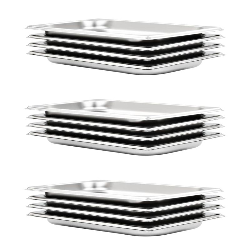 Тези стифиращи гастронорм контейнери ще бъдат чудесно допълнение към вашите кухненски съдове. Изработен от здрава неръждаема стомана, контейнерът за бен мари се отличава със здрава конструкция и се почиства лесно. Устойчивият материал предпазва тавите от драскотини и ги прави лесни за поддръжка. Тавата е с размери по стандарт гастронорм, което позволява универсална употреба и най-различни комбинации. Следователно тя ще се впише перфектно във всичките ви професионални кухненски шкафове и оборудване, като електрически сушилни, машини за миене на съдове и салатни барове. Съдовете могат да се подредят един в друга и да се приберат, за да пестят място, затова са много практични и идеални за използване в ресторанти, хотели, партита, както и у дома. Доставката включва 12 тави.