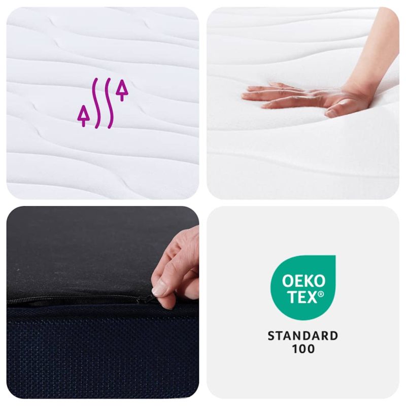 Този матрак с покет пружини е проектиран да ви осигури приятно усещане и комфортен сън у дома. Издръжливост и дълготрайност: Материята се отличава със семпъл и изчистен вид, като същевременно остава дишаща, удобна за кожата и дълготрайна. Индивидуална опора: Всяка спирална пружина, обвита в плат, реагира на вашите точки на натиск, осигурявайки целенасочена опора и равномерно разпределяйки натиска, който гръбнакът ви издържа. Облекчаване на натиска: Матракът с покет пружини има 7 зони за лягане, което ефективно облекчава напрежението и осигурява оптимална опора за всички части на тялото ви като стъпала, колене, бедра, кръст, гръб, рамене и глава. Подобрен комфорт: Пружинният матрак е проектиран с множество слоеве, включително слой от пяна, слой изолираща подложка и слой пружина. Тази комбинация осигурява меко до средно меко усещане и люлеещ комфорт за всички позиции за сън. Освен това матракът ефективно абсорбира шума и вибрациите, причинени от мятане и въртене, осигурявайки спокоен и необезпокояван сън. Лесна поддръжка: Пружинният матрак с пяна има дълъг цип, който улеснява свалянето на калъфа за почистване. Добре е да се знае:Калъфът на матрака може да се пере до 40 °C. Моля, не го перете твърде често. За ваше удобство матракът е компресиран и навит в кутия, като лесно можете да го местите и поставяте във вашата стая.
