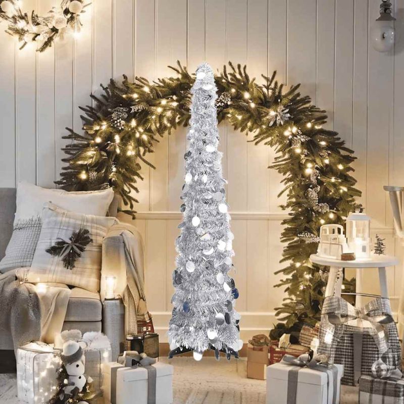 Нашата лъскава сребриста pop-up изкуствена елха създава приятна и уникална атмосфера за наближаващата Коледа. Това прекрасно коледно дърво, изработено от PET материал, е леко и може да се свие в малък размер за лесно съхранение. Празничната украса може да се използва наново всяка година, което я прави много икономичен избор в сравнение с естественото дърво. Освен това може да се използва както на закрито, така и на открито.
