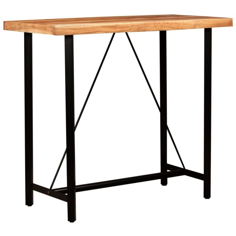Този естетичен бар комплект е с индустриален вид и ще бъде отличително допълнение към всеки дом, бар или ресторант. Бар масата е изработена от масивна дървесина. Здравите стоманени крака правят бар масата много здрава и издръжлива и добавят към нейния внушителен индустриален стил. Перфектната изработка гарантира, че всяка стъпка от процеса на производство се извършва с най-голямо внимание – било то полиране или лакиране. Бар столовете с емблематичен вид са тапицирани с естествена кожа, която е мека на допир и прави стола изключително издръжлив. Меката седалка от козя кожа с хубави диамантени шевове осигурява удобно седене, докато плътните железни крака с поставка за крака правят табуретката стабилна и издръжлива. Бар комплектът се сглобява лесно. Доставката включва 1 маса и 4 стола от естествена кожа. Важна забележка: Дървесните шарки и цветовете могат да варират, което прави всеки артикул уникален. Доставката е на случаен принцип, което гарантира ексклузивността и индивидуалността на вашия продукт.