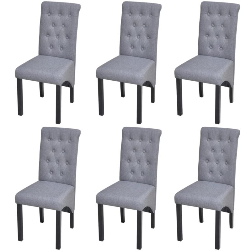 Нашите трапезни столове се отличават с елегантен и непреходен дизайн, така че да привличат вниманието във вашата трапезария или кухня. Покрити с дебела, мека на допир тапицерия, тези столове са с ергономичен дизайн, за да ви предложат удобно седене. Масивните дървени крака допринасят за стабилността и здравината на столовете. Трапезните столове се сглобяват лесно. Доставката включва 6 трапезни стола. Максимално 110 кг на седалка. Съобразете се с риска от открит огън и други източници на силна топлина в близост до продукта.