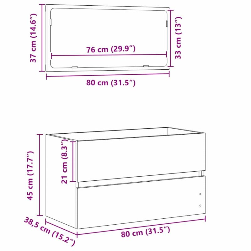 Този комплект за баня съчетава свежи линии с практичност и предлага модерен минимализъм. Идеален е за тези, които търсят стилно и удобно обновление на банята. Подходящ е за съвременни интериори, максимизирайки полезността. Състав от инженерна дървесина Изработен от надеждна инженерна дървесина, този комплект демонстрира качеството на съвременните мебели. Тя осигурява устойчива повърхност, идеална за баня, която се използва често. Комплектно решение за баня Включва плоско огледало 80 x 37 см и шкаф за мивка 80 x 38.5 x 45 см. Предлага пространство за съхранение и отразяване, без да претрупва стаята, създавайки изчистена обстановка. Монтиране на стена Лесно е за монтаж и спестява пространство. Стенният монтаж дава плаващ ефект, освобождавайки пода и улеснявайки почистването. Функционални акценти Рамка от инженерна дървесина и чекмеджета осигуряват дълготрайност в хумидни условия. Конструкцията е проектирана за съвременни домове и съчетава стила с практичността. Лесни инструкции за поддръжка За лесна поддръжка, просто избърсвай с влажна кърпа, за да поддържаш свеж вид. Редовната грижа осигурява дълготрайност.