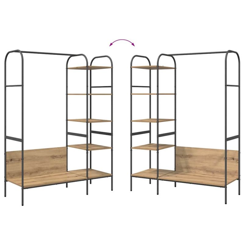 Тази модерна стойка за дрехи предлага изчистени линии и простота, което я прави перфектна за всяка всекидневна. С праволинеен дизайн и минималистичен стил е чудесна за тези, които искат да съчетаят естетика и функционалност. Изработена от инженерна дървесина и стомана, предлага добро решение за запазване на реда в гардероба. Състав на материала: Изработена от инженерна дървесина, стойката осигурява както здравина, така и стил. Материалите са издръжливи и леки, което улеснява преместването ѝ. Съвременна естетика: Правоъгълният дизайн отговаря на съвременните стилове на декор, а черната рамка добавя модерен щрих в помещението. Интегрирано съхранение: С просторни рафтове, тази стойка предлага чудесно място за съхранение на дрехи, обувки и аксесоари. Изисквания към монтажа: Лесен монтаж, само с отвертка и двама души, позволява бърза употреба. Грижа и безопасност: Инструкции за закрепване към стената предотвратяват преобръщане. Лесно се поддържа, просто я избърсвайте редовно.