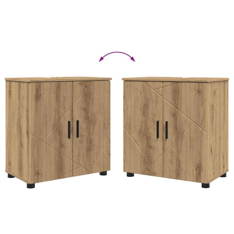 Този шикозен шкаф за баня е перфектното решение, ако искате да добавите стил в интериора си. С правоъгълната си форма и модерен вид, шкафът предлага много място за съхранение, без да изглежда натрапчиво. Чистите линии във визията му добавят изтънченост и го правят подходящ за всякакъв декор. Комбинира чудесно естествената красота на инженерната дървесина с метални крака, предлагащи модерен акцент за стилни домове. Модерна простота: Този шкаф е с минималистичен дизайн, с ясни линии и деликатни детайли. Идеален за модерни интериори, създава усещане за спокойствие и ред в банята. Здрав заден панел: Задната част е изработена от инженерна дървесина за дълготрайна употреба, запазвайки формата и стила през годините. Обширно съхранение: Шкафът разполага с големи отделения за организиране на хавлии и тоалетни принадлежности. Умелото използване на пространството предотвратява бъркотията и поддържа всичко на лесно достъпно място. Сигурни врати с панти: Вратите с панти осигуряват безопасность и подреден вид, като позволяват лесен достъп до съхранените предмети. Универсално подходящ: Проектиран да се интегрира лесно в различни интериори, този шкаф е идеален за всякакви бани и позволява удобно пренареждане без нужда от прикрепяне към стената.
