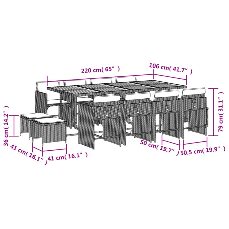 Този градински трапезен комплект е чудесен избор за вечеря на открито или просто за почивка в градината, задния двор или във вътрешния двор. Издръжлив материал: PE ратан, известен също като полиратан, е здрав синтетичен материал с малко необходима поддръжка, който прилича на естествен ратан. Той е лек, лесен за почистване и често се използва за външни мебели поради своята издръжливост и устойчивост на атмосферни влияния.Компактно съхранение: Тези столове имат падаща облегалка, която може да се сгъва, което улеснява съхранението им под масата. Когато са сгънати, те се побират под масата, оформяйки спестяваща място форма на куб. Освен това табуретките могат да се съхраняват и под столовете, което допълнително увеличава ефективността на пространството.Удобна седалка: Тази мебел за открито, снабдена с плътно подплатени възглавници, предлага удобство при сядане.Калъф, който може да се сваля и може да се пере: Тези възглавници за седалки имат подвижни калъфи за лесно пране и поддръжка. Калъфките за възглавници на столовете имат капак отзад за лесно закрепване към столовете.Стабилен и лесен за почистване плот: Тази градинска маса има плот от акациево дърво, който е здрав, издръжлив и лесен за почистване с влажна кърпа. Добре е да се знае: За да сте сигурни, че вашите външни мебели ще останат красиви, ви препоръчваме да ги защитите с водоустойчиво покривало.
