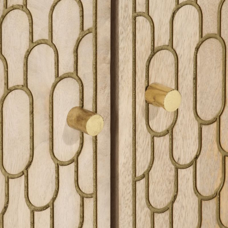 Този шкаф за мивка за баня е предназначен да бъде чудесно допълнение към вашата баня, придавайки ѝ ретро и елегантен вид! Масивна мангова дървесина: Масивната дървесина от манго е здрава тропическа дървесина, от която се произвеждат здрави мебели. Красивите ѝ дървесни шарки правят всяка мебел малко по-различна от следващите. Изработен от масивно мангово дърво, шкафът за под мивка е издръжлив и стабилен.Достатъчно място за съхранение: Тоба обзавеждане за баня предлага достатъчно място за съхранение, където да държите вашите принадлежности добре организирани и подръка.Практичен плот на шкафа: Горната част на шкафа за мивка е снабден с дупка, така че е идеален за поставяне на мивката.Крака от дърво: Дървените крака придават на продукта естествен и приятен вид, като същевременно осигуряват стабилност. Може да се съчетае добре с всеки интериорен декор.Ръчно издълбан дизайн: Тези мебели за баня с ръчно издълбани шарки внасят лукса на елегантния чар във вашия интериор, като се превръща във фокусна точка на стаята ви. Добре е да се знае:Всеки артикул е уникален с вариации в цветове и зърна. Доставката е на случаен принцип, което гарантира ексклузивността и индивидуалността на вашия продукт. Внимание:За да предотвратите преобръщане, този продукт трябва да се използва с предоставеното устройство за закрепване на стена.