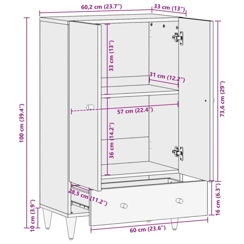 Този класически висок шкаф е предназначен да бъде декоративно и практично допълнение към вашия дом. Масивна мангова дървесина: Масивната дървесина от манго е здрава тропическа дървесина, от която се произвеждат здрави мебели. Красивите ѝ дървесни шарки правят всяка мебел малко по-различна от следващите. Изработен от масивно мангово дърво, шкафът е издръжлив и стабилен.Достатъчно място за съхранение: Бюфетът предоставя достатъчно място за съхранение, където да държите различни вашите вещи добре организирани и леснодостъпни.Практична врата: Поддържайте реда в помещението, като скриете дребните неща зад вратичките на този шкаф.Крака от дърво: Дървените крака придават на продукта естествен и приятен вид, като същевременно осигуряват стабилност. Може да се съчетае добре с всеки интериорен декор.Ръчно издълбан дизайн: Този шкаф за съхранение с ръчно издълбани шарки внася лукса на елегантния чар в интериора ви, като се превръща във фокусна точка на вашата стая. Добре е да се знае:Всеки артикул е уникален с вариации в цветове и зърна. Доставката е на случаен принцип, което гарантира ексклузивността и индивидуалността на вашия продукт. Внимание:За да предотвратите преобръщане, този продукт трябва да се използва с предоставеното устройство за закрепване на стена.