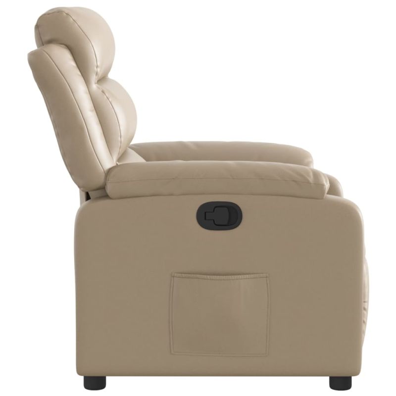 Облегнете се и се отпуснете в този изключително комфортен наклоняем стол! Функция за ръчно накланяне: Този накланящ се стол има дръжка от дясната страна. Можете ръчно да настроите поставката за крака и облегалката до произволна позиция според вашето удобство с просто издърпване на дръжката. Тази функция позволява максимален наклон от 135 градуса. Освен това облегалката може бързо да се върне на първоначалното си място с лесно издърпване на дръжката.Удобно седене: Дебело подплатената седалка, облегалката и широките подлакътници, покрити с изкуствена кожа, осигуряват уютно усещане, което ви кара да се чувствате като в прегръдка, докато седите. Изкуствената кожа е много издръжлив материал. Устойчива е на петна, което я прави лесна за почистване с влажна кърпа. Гладката повърхност също така придава луксозен вид и красотата на естествената кожа.Удобен страничен джоб: Този фотьойл има страничен джоб, за да държите основните си вещи леснодостъпни.Здрава и стабилна рамка: Рамката, изработена от дърво и метал, осигурява здрава структура и стабилност. Този накланящ се фотьойл е удобен и издръжлив.