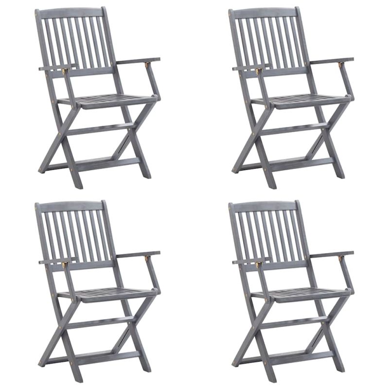 Този модерен комплект дървени трапезни столове с възглавници ще добави щрих на естествен стил към градината, терасата или вътрешния двор. Този комплект сгъваеми столове ще бъде чудесен избор за вечеря. Трапезните столове са изработени от масивно акациево дърво – тропическа твърда дървесина, която ги прави устойчиви на атмосферни влияния и издръжливи за дългогодишна употреба. Масивната акациева дървесина има силата да понесе тежестта и да издържи на износването на времето. Сивата избелена повърхност се почиства лесно с влажна кърпа. Столовете могат да се сгъват, за да пестят място, когато не се използват. Освен това включените възглавници осигуряват допълнителен комфорт при почивка или хранене. Всяка възглавница разполага с два комплекта връзки за плътно закрепване към стола. Максимално 110 кг на седалка.