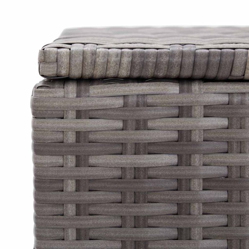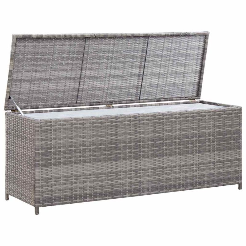 Тази кутия за съхранение от полиратан може да се използва за съхранение на възглавници за градински мебели, възглавнички, допълнителни одеала или хавлиени кърпи, както и предмети от бита и много други. Кутията за съхранение е наистина универсална, тъй като може да се използва и като пейка, благодарение на високата си издръжливост на натоварване! Красиво изработената ракла е с модерен дизайн, който ще се впише във всяко външно жилищно пространство. Тази устойчива градинска кутия за съхранение е изработена от висококачествен полиратан и има изключително здрава прахово боядисана стоманена рамка. Забележка: Моля, покрийте кутията за възглавници с водоустойчив плат/материал, за да предотвратите проникването на вода в кутията при дъжд.